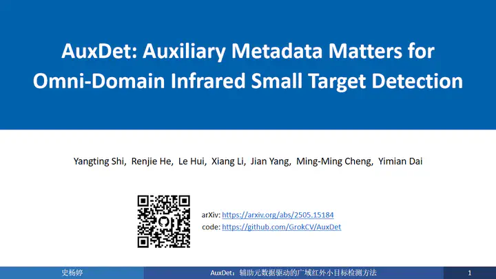 本文介绍了一种引入图像元数据(成像平台、成像波段、图像分辨率)的多模态红外小目标检测新范式 AuxDet,利用元数据隐含的物理先验实现图像特征的样本级动态调制,增强模型在广域检测中的泛化能力。